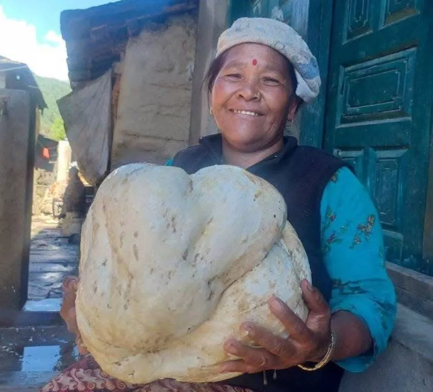 म्याग्दीको धवलागिरी गाउँपालिका-१, गुर्जाकी स्थानीय छेमकुमारी छन्त्यालले ५ केजीभन्दा बढी तौल भएको विशाल गोलोवाच अर्थात क्याल्भाटिया गिगान्टिया च्याउ भेटिएको छ । स्थानीय छेमकुमारी छन्त्यालले घर नजिकै रहेको बारीमा काम गर्ने क्रममा ठूलो आकारको सेतो च्याउ भेटाउनुभएको हो । ठूलो आकारको च्याउ भेटिएपछि घरमा ल्याएको छन्त्यालले बताउनुभयो । ‘धेरै किसिमका च्याउ देखिपनि बलजस्तो देखेपछि दंग परे, विषालु नहुने भएपछि पकाएर खायौं’छन्त्यालले भन्नुभयो ।