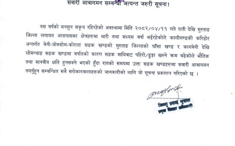 मुस्ताङका प्रमुख जिल्ला अधिकारी विष्णुप्रसाद भुषालद्धारा जारी गरिएको अपिलमा वारागुङ मुक्तिक्षेत्र गाउँपालिका छुसाङ हुदैं उपल्लो मुस्ताङ जोड्ने सडकखण्डमा बाढीपहिरोको उच्च जोखिम रहेकाले सम्भावित सवारी दुर्घटनालाई मध्यनजर गर्दै रातको समयमा मोटरसाइकल र अन्य सवारीसाधनमा यात्रा नगर्न अनुरोध गरिएको छ ।