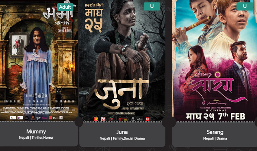 काठमाडौँ- आजदेखि एकसाथ तीन चलचित्रको प्रदर्शन सुरु भएको छ । मङ्सिर र पुसमा निकै कम सङ्ख्यामा चलचित्र प्रदर्शन भए पनि माघको अन्तिम सातादेखि आउँदो केही महिना हरेक हप्ता दुईदेखि तीन चलचित्र प्रदर्शन हुने घोषणा गरिएको छ । यसै क्रममा आजदेखि ‘मम्मी’, ‘जुना’ र ‘सारङ्ग’ को प्रदर्शन सुरु भएको छ ।