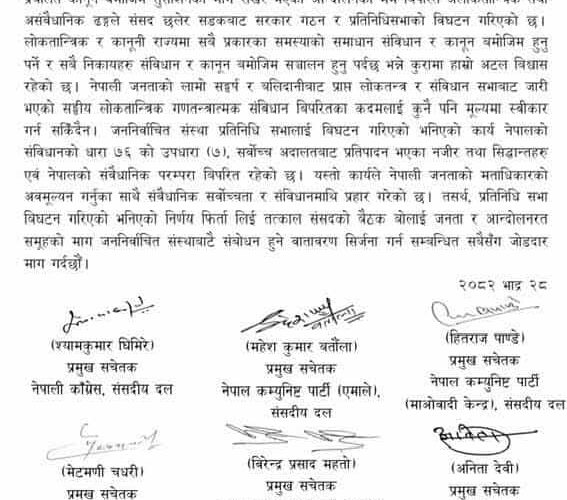 २८ भदौ, काठमाडौं । विघटित प्रतिनिधिसभाका ८ वटा राजनीतिक दलहरूले प्रतिनिधिसभा विघटनलाई असंवैधानिक भनेका छन् ।