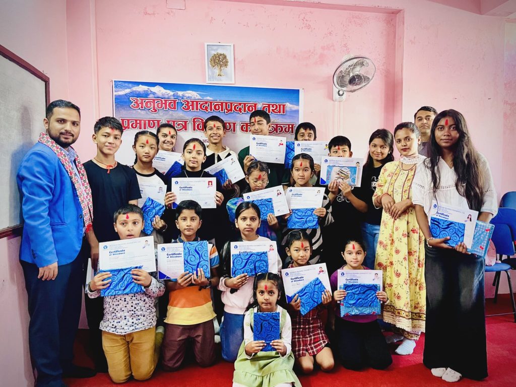 पोखरा कार्तिक १०/ पोखराको सृजना चोकमा रहेको फ्रीडम ट्रेनिङ्ग सेन्टरमा अनुभव आदनप्रदान तथा प्रमाणपत्र बितरण कार्यक्रम सम्पन्न भएको छ । १५ दिन सम्म सञ्चालन भएको उक्त उद्घोषण तथा भाषणकला तालिम लिईएका १७ जना बिद्यालय स्तीय बालबालिकाहरुको सहभागिता रहेको तालिमका प्रमुख प्रशिक्षक तथा ट्रेनिङ्ग सेन्टरका सञ्चालक बिनोद पाहारीले जानकारी दिनुभयो । समापन कार्यक्रममा प्रशिक्षार्थीहरुलाई प्रमाणपत्र बितरण तथा तालिम पश्चातको अनुभव र बिभिन्न अवार्डले सम्मान समेत गरिएको थियो ।