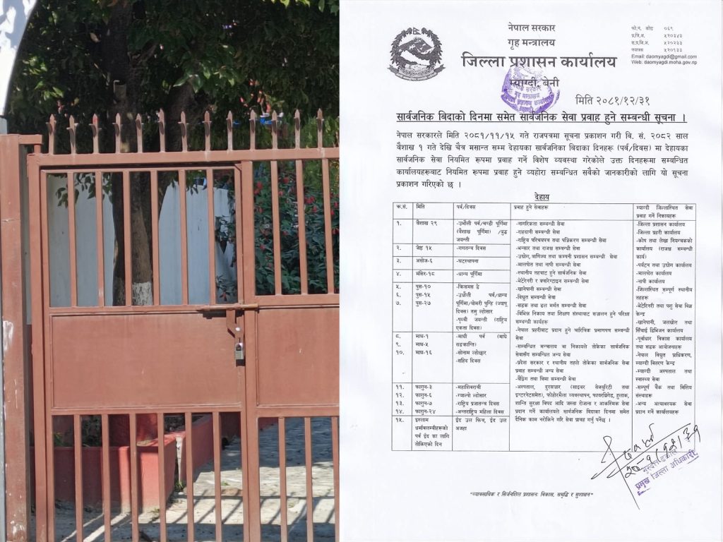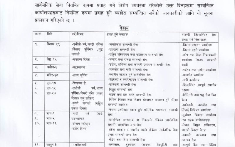 के थियो सरकारी निर्णय? नेपाल सरकारले मिति २०८१/११/१५ गते राजपत्रमा सूचना प्रकाशन गर्दै वि.सं. २०८२ साल वैशाख १ गतेदेखि चैत्र मसान्तसम्मका विभिन्न १५ वटा सार्वजनिक बिदाका दिनमा सरकारी सेवा नियमित गर्ने निर्णय गरेको थियो। सोही निर्णयका आधारमा म्याग्दी जिल्ला प्रशासन कार्यालयले पनि सूचना जारी गर्दै नागरिकता, राहदानी, स्वास्थ्य, विद्युत, खानेपानी, र बैंकिङ्ग जस्ता अत्यावश्यक सेवाहरू नरोक्न निर्देशन दिएको थियो ।