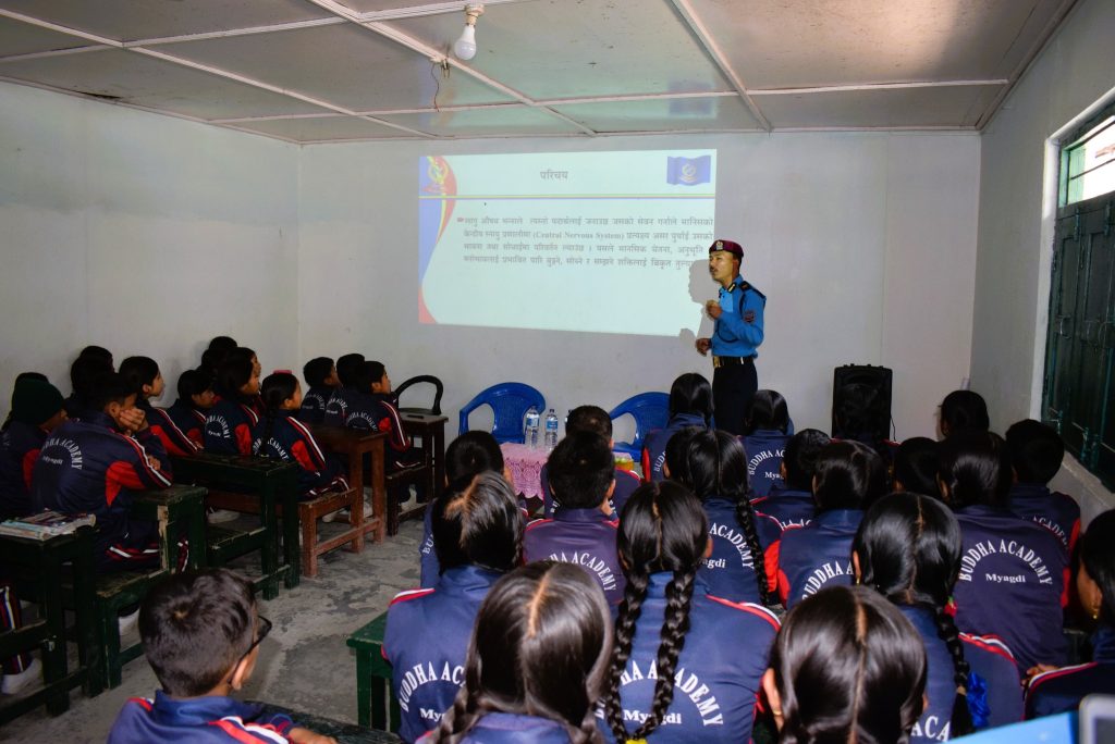 कार्यक्रममा बुद्ध एकेडेमीका शिक्षक, कर्मचारी तथा ठूलो संख्यामा विद्यार्थीहरूको उपस्थिति रहेको थियो। पछिल्लो समय जिल्ला प्रहरी कार्यालय म्याग्दीले ‘समुदाय-प्रहरी साझेदारी’ कार्यक्रम अन्तर्गत जिल्लाका विभिन्न विद्यालयहरूमा पुगेर सामाजिक विकृति र विसंगति विरुद्ध सचेतना फैलाउने अभियानलाई तीव्रता दिएको छ।