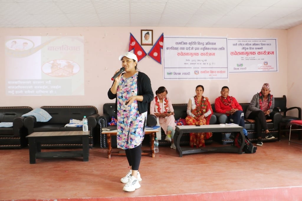 म्याग्दीको अन्नपूर्ण गाउँपालिका–६, घारमा सामाजिक कुरिती विरुद्धको अभियानअन्तर्गत बालविवाह र दाइँजो प्रथा न्यूनीकरणका लागि सचेतनामूलक कार्यक्रम सम्पन्न भएको छ । सामाजिक विकास कार्यालय र मिलन म्याग्दीको आयोजना तथा अन्नपूर्ण गाउँपालिकाको सहकार्यमा शुक्रवार कार्यक्रम गरिएको हो ।