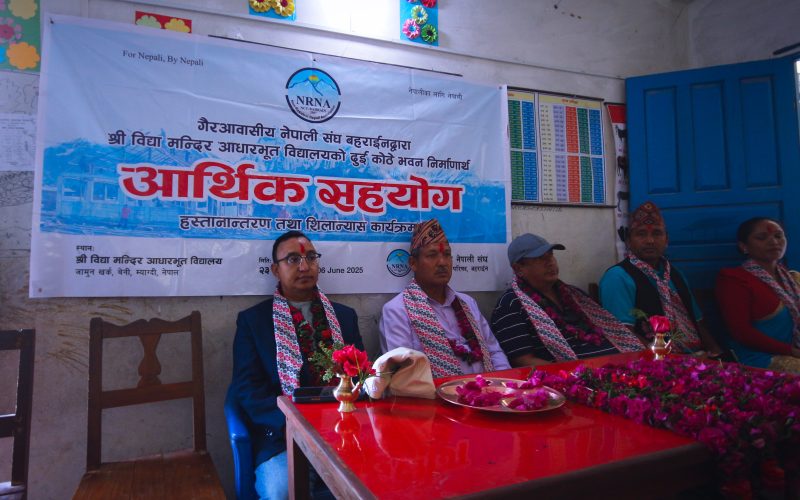 म्याग्दी, बेनी – गैर आवासीय नेपाली संघ (NRNA) बहराइनको आर्थिक सहयोगमा म्याग्दी जिल्लाको बेनी नगरपालिका–६, जामुखर्कस्थित श्री विद्या मन्दिर आधारभूत विद्यालयमा दुई कोठे भवन निर्माण सुरु गरिएको छ। शुक्रवार एक कार्यक्रमका बीच सो भवनको शिलान्यास तथा आर्थिक सहयोग हस्तान्तरण गरिएको हो।