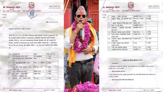 उनका अनुसार सदरमुकाम बेनीबजार तटबन्ध निर्माणको लागि, खहरेखोला–छिस्बाङ–खोप्ती –दरबाङ सडक, सिमलचौर–मिथौला–कुकुर विसौना–पुर्णगाउँ सडक स्तरोन्नती, रुन्मा–मगरदाङ–जुग्जा सडक स्तरोन्नती, पात्लेखोला–नेपाने–मौवाफाँट–बान्द्रे जोद्रेघाट पुल, चिप्लो पहिरो–दग्नाम –दर्मिजा–चिमखोला–घ्यासीखर्क सडक, तोरीपानी– दावा –धोलथान सडक, लमसुङ–लुलाङ–गुर्जा सडक योजनालाई प्रति आयोजना तीन करोड बजेट विनियोजन भएको छ ।